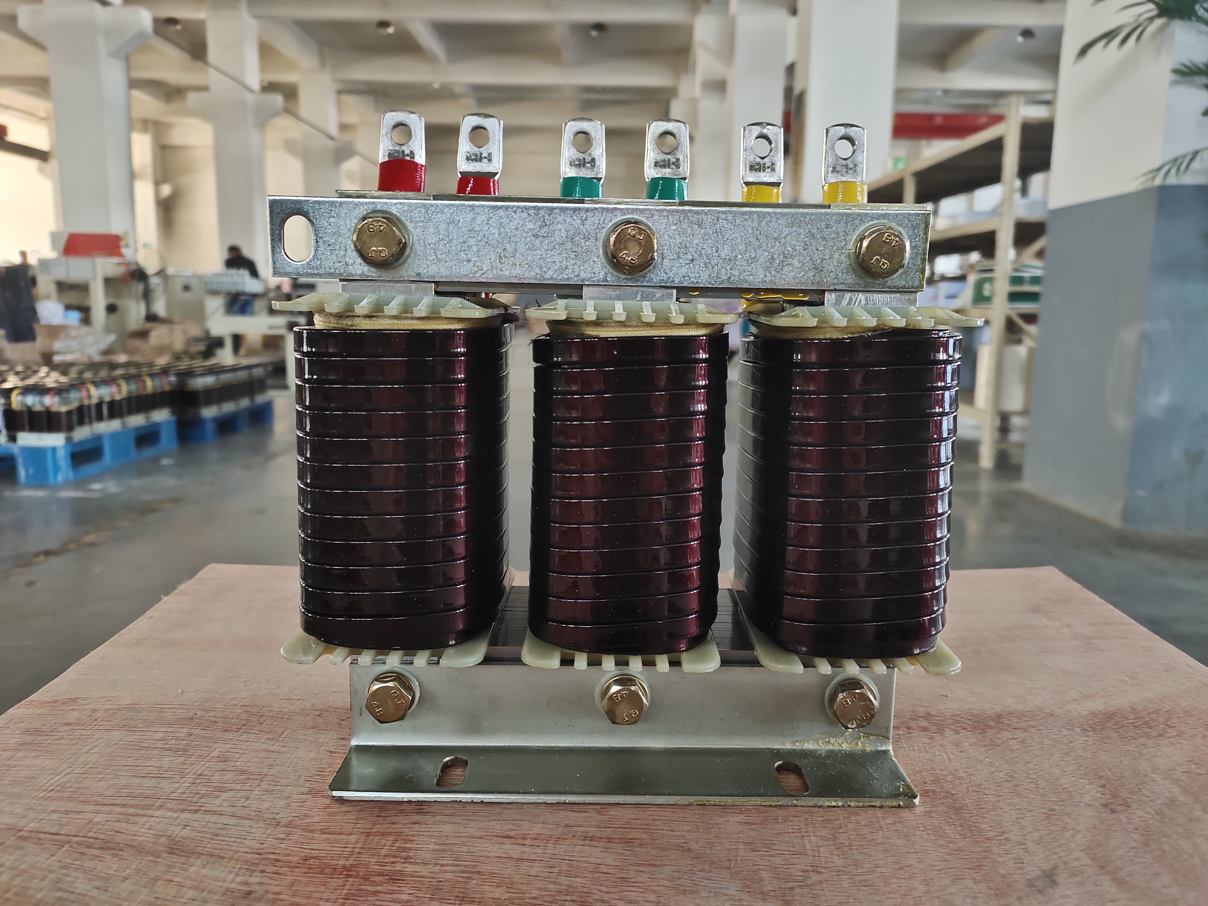 4.电抗器的线圈和铁芯组装成一体后经过预烘→真空浸漆→热烘固化这一工艺流程,采用H级浸渍漆,使电抗器的线圈和铁芯牢固地结合在一起,不但大大减小了运行时的噪音,而且具有极高的耐热等级,可确保电抗器在高温下亦能安全地无噪音地运行。5.电抗器芯柱部分紧固件采用无磁性材料,确保电抗器具有较高的品质因数和较低的温升,确保具有较好的滤波效果。